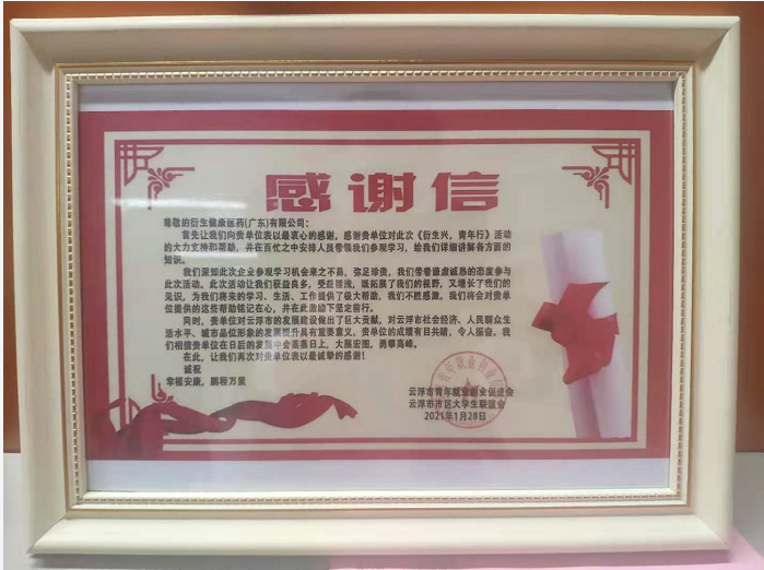 云浮市市区大学生联谊会赠予衍生健康医药感谢信